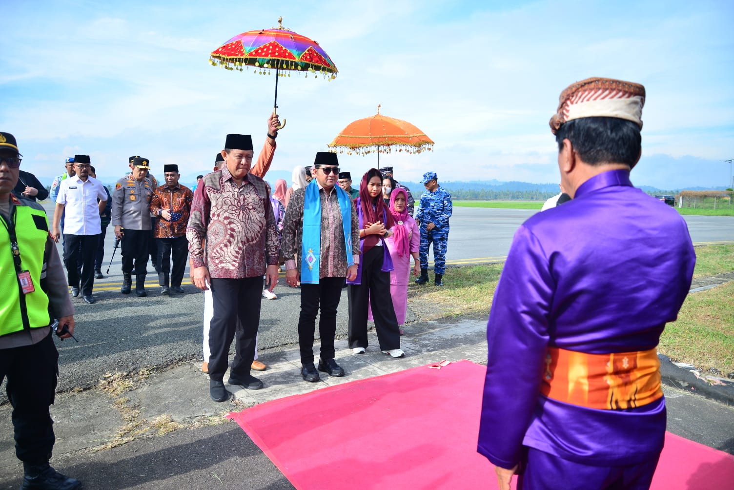 Prosesi adat berlangsung khidmat di Bandara Djalaluddin, saat rombongan menteri tiba dengan pesawat Garuda pukul 07.30 Wita. Penyambutan dilakukan langsung oleh Gubernur Gorontalo Gusnar Ismail bersama jajaran Forum Koordinasi Pimpinan Daerah (Forkopimda) dan sejumlah pimpinan Organisasi Perangkat Daerah (OPD) Pemprov Gorontalo.